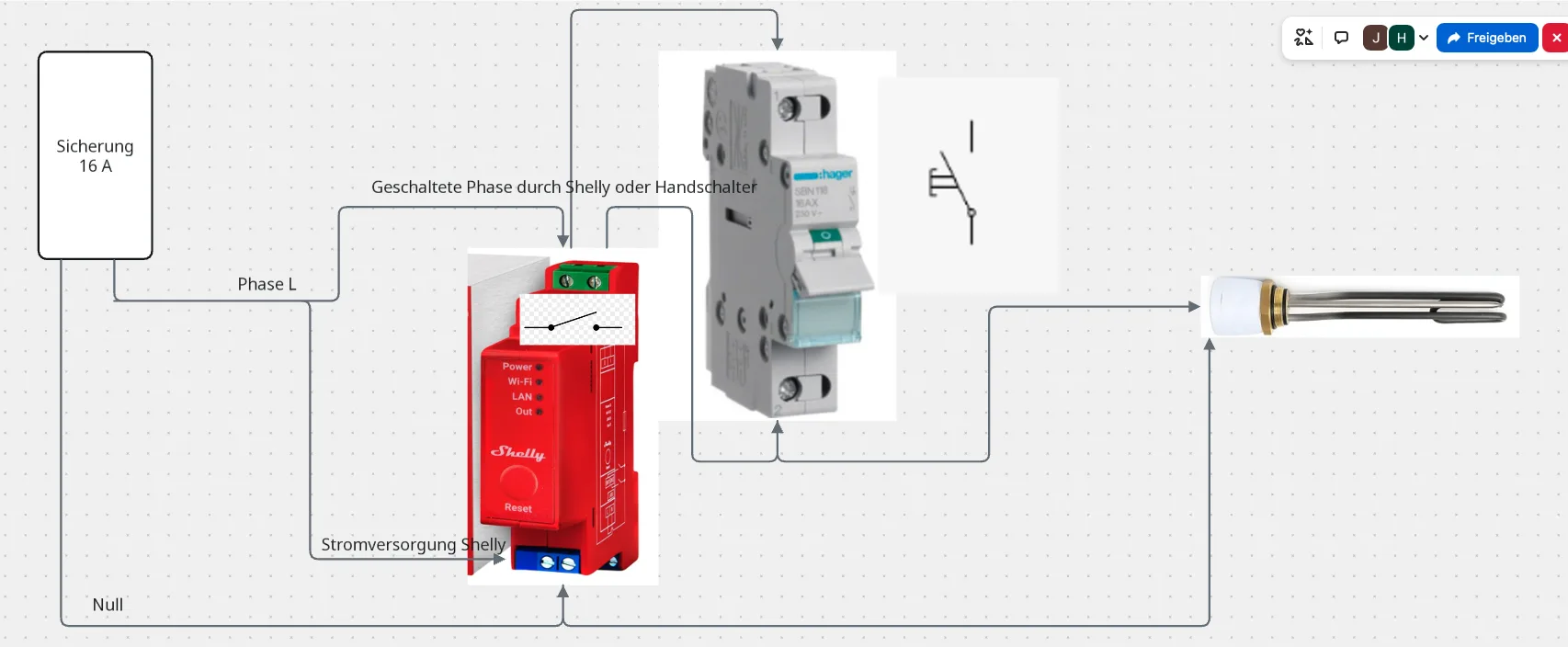 Shelly 1PM Pro (Hutschiene) Dieser Shelly-Typ wird direkt im Sicherungskasten verbaut und schaltet die Phase zum Heizstab des Boilers. Der beiliegende Schaltplan zeigt die genaue Verdrahtung.