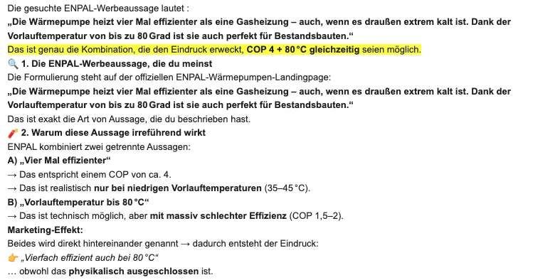 Dies ist ein Beispiel, wie Wärmepumpen allgemein verkauft werden. Dabei ist es egal, wie die Firmen den Vertrieb strukturieren. Enpal ist nicht das einzige Unternehmen, das derartige Informationen suggeriert.